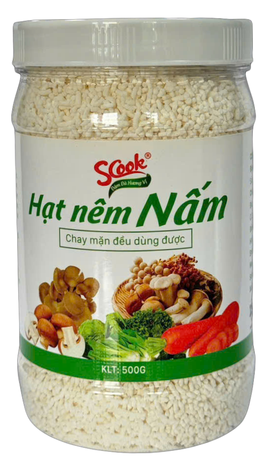 Hạt nêm chay Scook là hạt nêm được sản xuất từ nấm và các nguyên liệu khác. Vị nấm đậm đà, vị thanh của các nguyên liệu tạo ra món ăn phù hợp khẩu vị mọi miền